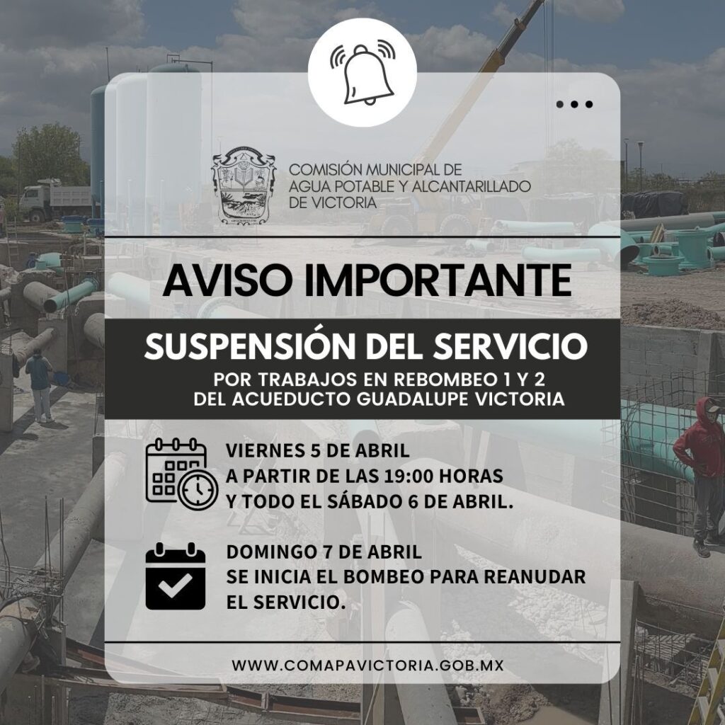 • Trabajos de mantenimiento en el acueducto Guadalupe Victoria afectarán el suministro desde el viernes hasta el domingo.