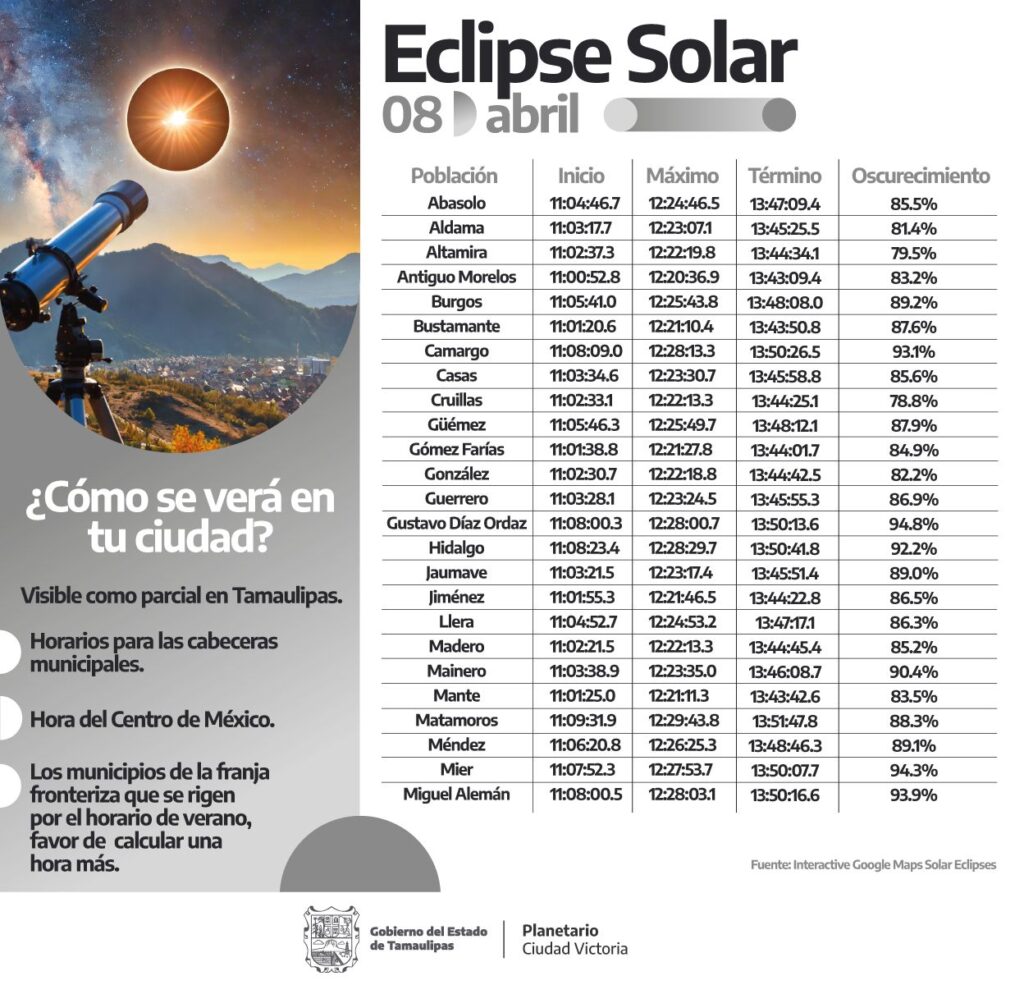 Según el Planetario «Dr. Ramiro Iglesias Leal» en Ciudad Victoria, Nuevo Laredo experimentará un eclipse solar con una visibilidad del 97.9%, mientras que en Tampico y Madero se espera una perceptibilidad del 78.8% y 85.2%, respectivamente.